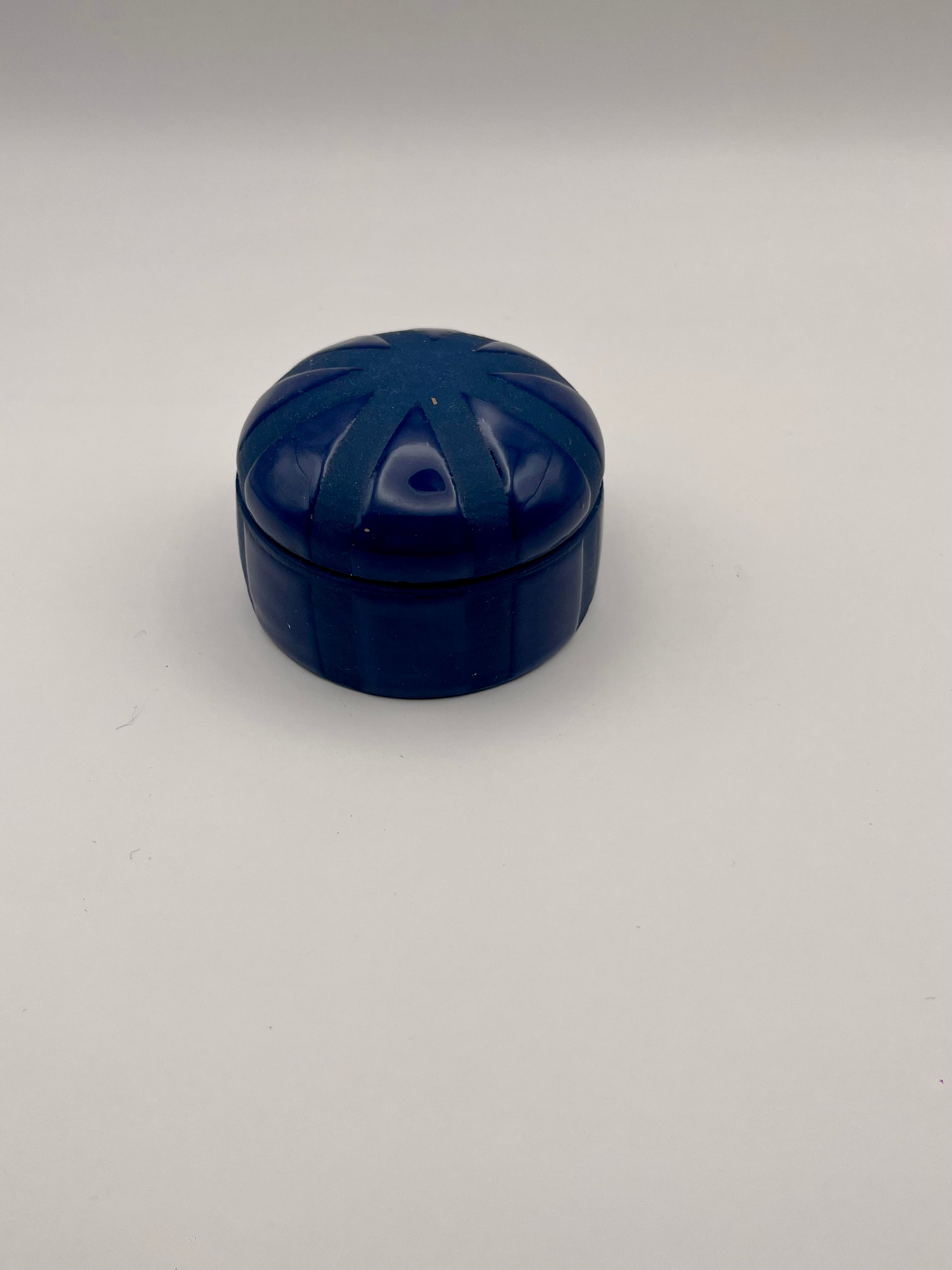 Cette boîte tournée au tour est recouverte d’un engobe bleu nuit profond, sublimé par un émail transparent brillant appliqué par endroits. La finition combine habilement des zones bleu mat et brillant, créant un contraste subtil qui met en valeur la texture et la profondeur des couleurs.