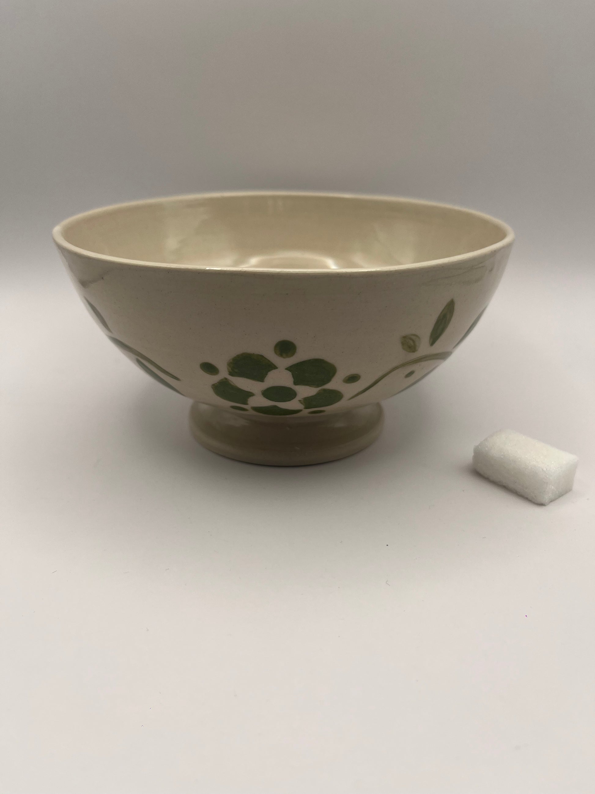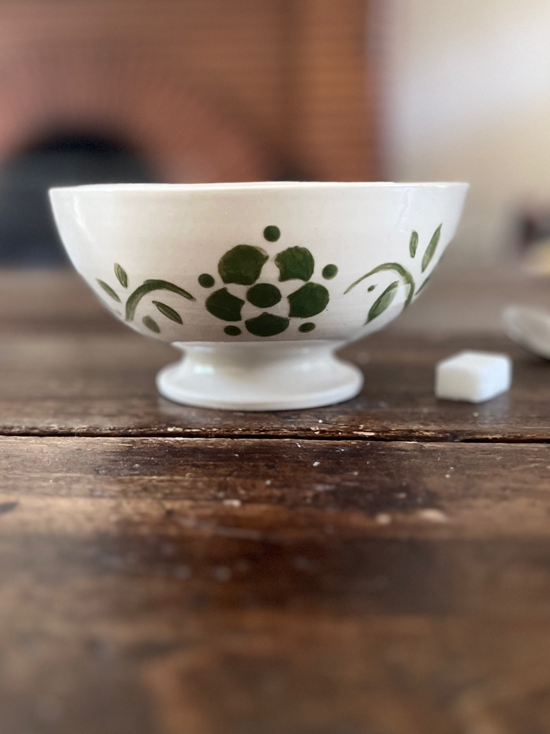 Ce bol campagne, réalisé au tour et décoré de feuilles vertes peintes à la main, combine utilité et élégance. Parfait pour vos petits déjeuners, il offre une prise en main confortable et une solidité qui convient à un usage quotidien à table.