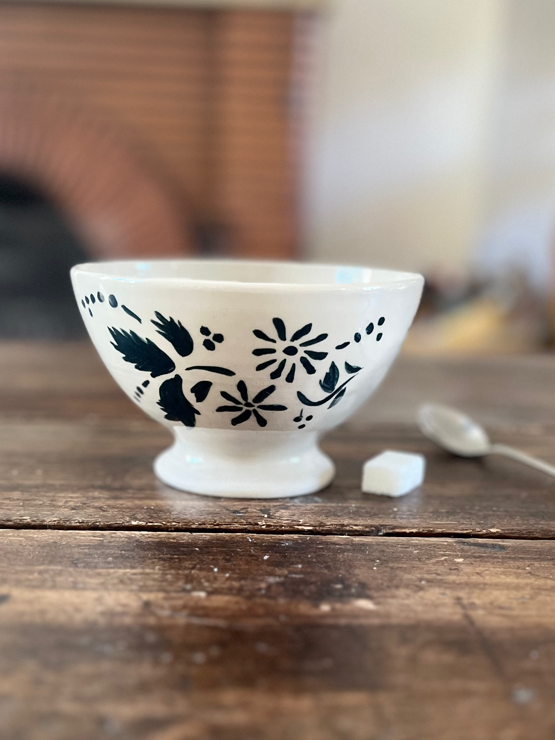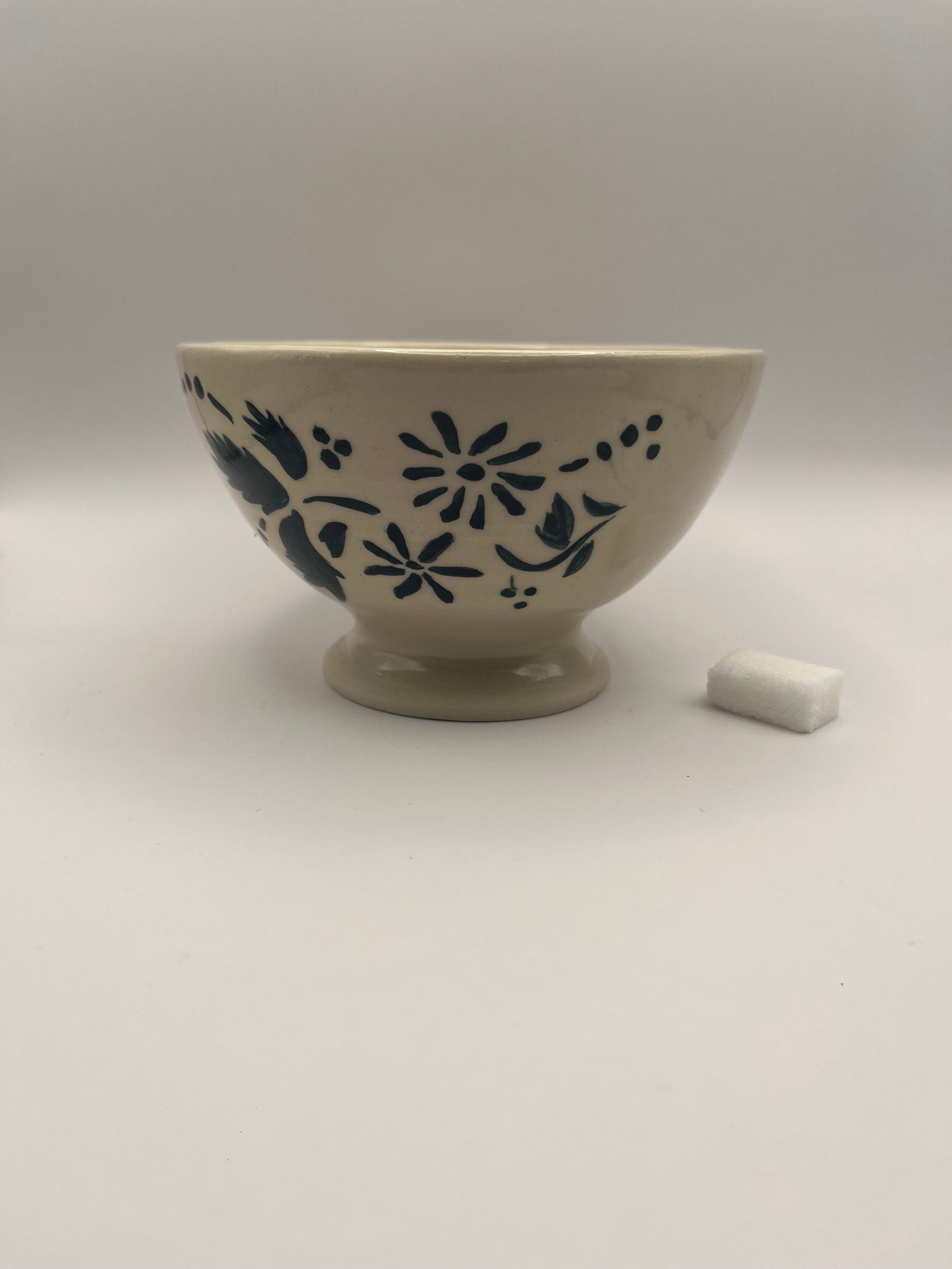 Ce bol campagne, soigneusement façonné au tour et décoré de fleurs vert foncé peintes à la main, combine praticité et beauté. Parfait pour accompagner vos petits déjeuners, il est solide et agréable à tenir, s’intégrant parfaitement à une utilisation quotidienne à votre table.