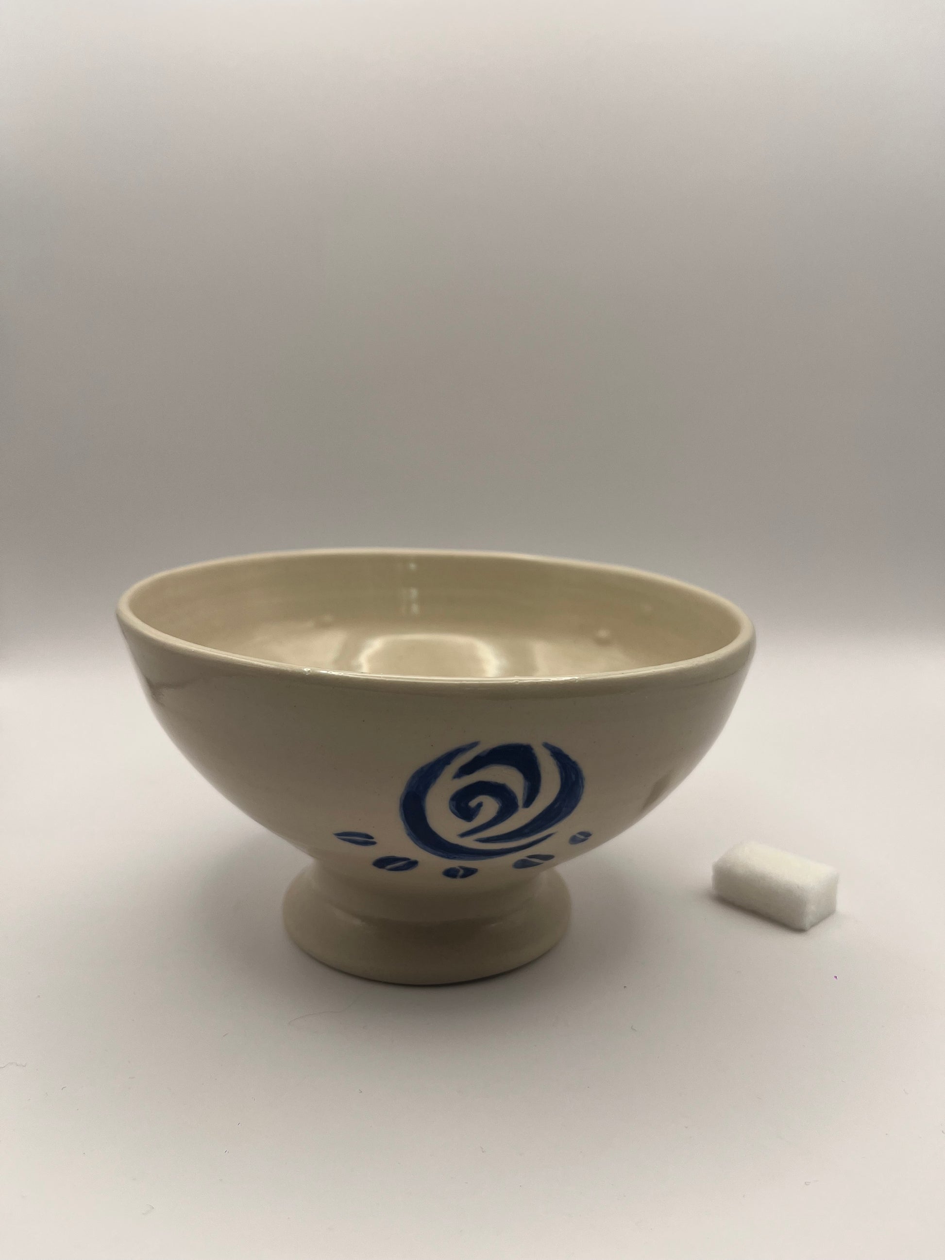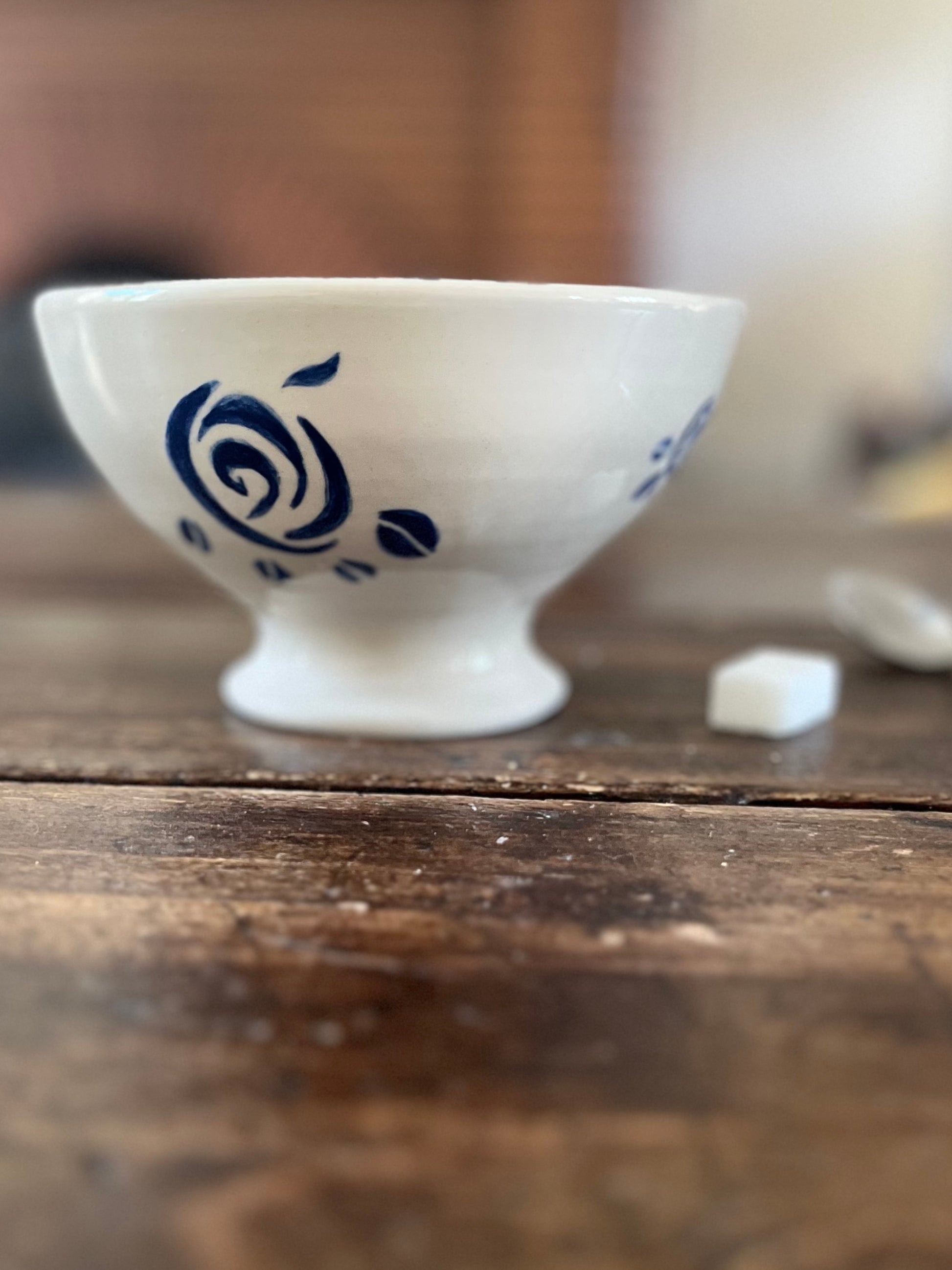 Ce bol campagne façonné au tour, décoré de roses bleues peintes à la main, combine fonctionnalité et charme. Parfait pour vos petits déjeuners, il est solide et agréable à manipuler, se prêtant aisément à un usage quotidien à table.
