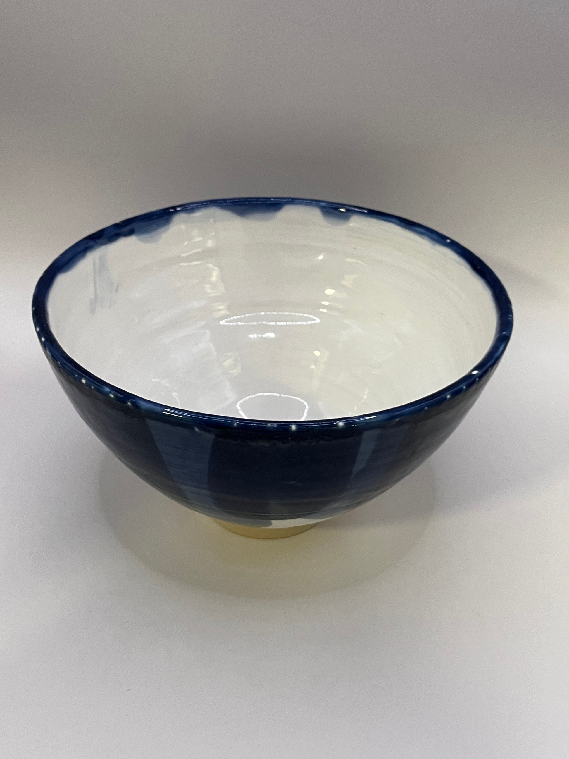 Finition : Intérieur engobe porcelaine plus couverte brillante et extérieur émail bleu, bleu, bleu brillant, le pied est brut