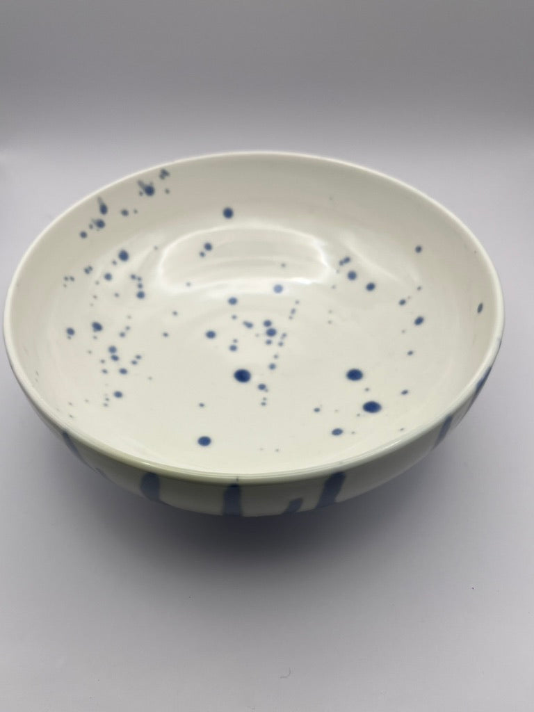 Saladier en porcelaine tourné au tour de potier, égayé par un émail espiègle obtenu via versement et projection d'émail – une pièce unique où l'art culinaire rencontre la fantaisie créative.