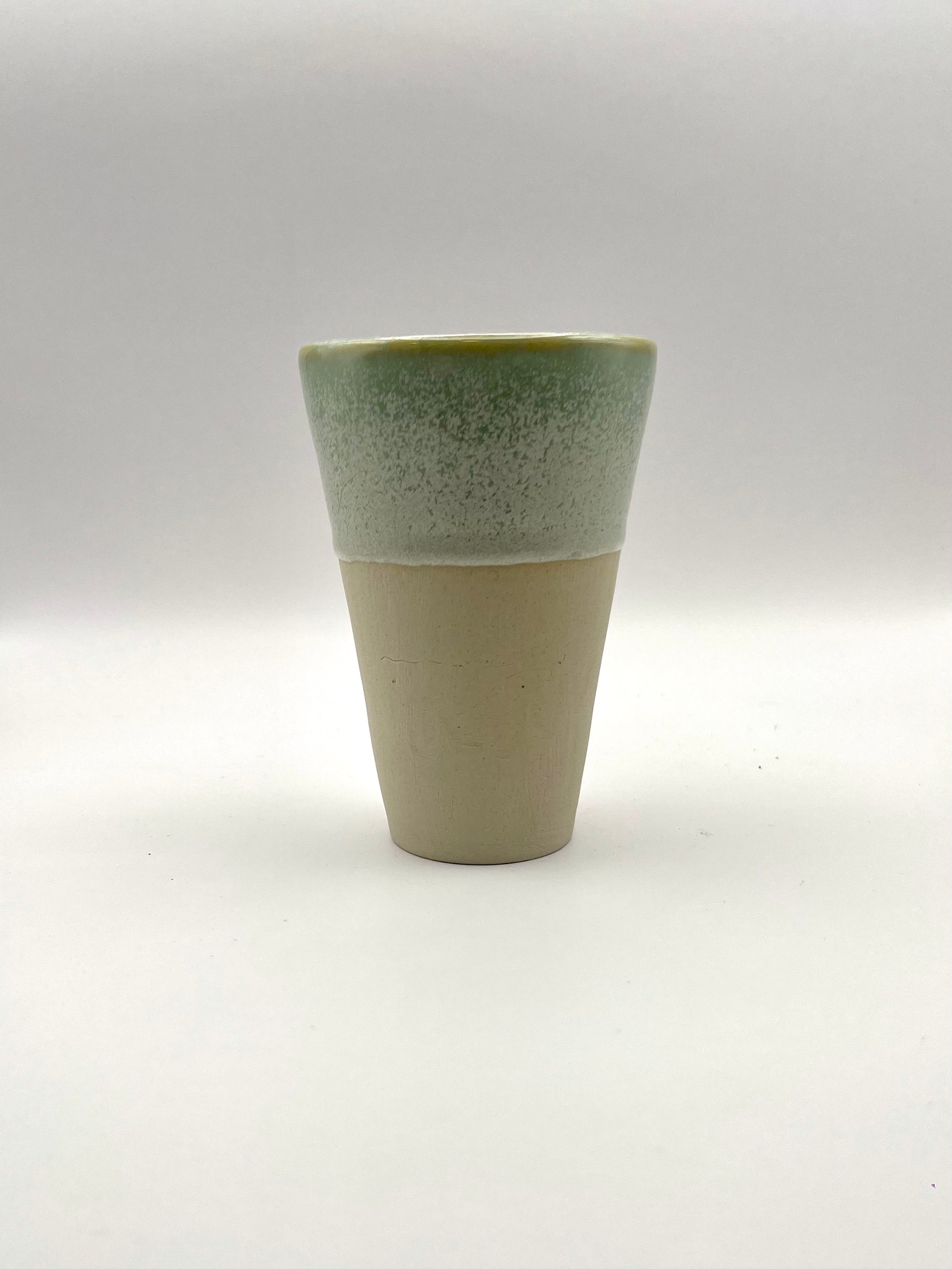 Cette tasse en grès, tournée à la main avec soin, allie simplicité et élégance. Son design conique minimaliste est rehaussé par un émail vert doux, fabriqué artisanalement, qui met en valeur la texture naturelle de l’argile brute. Pièce unique, créée avec attention pour vous accompagner au quotidien